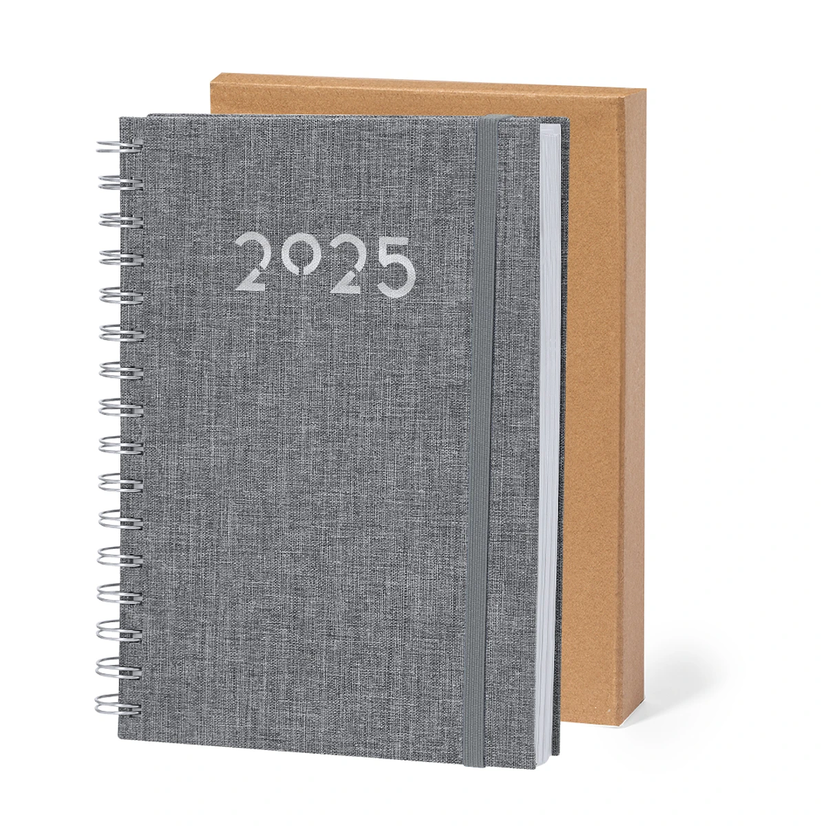 Agenda de anillas tamaño A5 fabricada en suave poliéster RPET. Con tapas rígidas y cierre de goma elástica a juego. Incluye caja kraft de presentación. Cuenta con distintivo RPET.Diseño página día, zona de anotaciones y marcapáginas de tela. En 2 idiomas: castellano e inglés. El material RPET se elabora a partir de plástico reciclado, para así fomentar la reutilización de residuos plásticos y ayudar a la sostenibilidad del planeta.