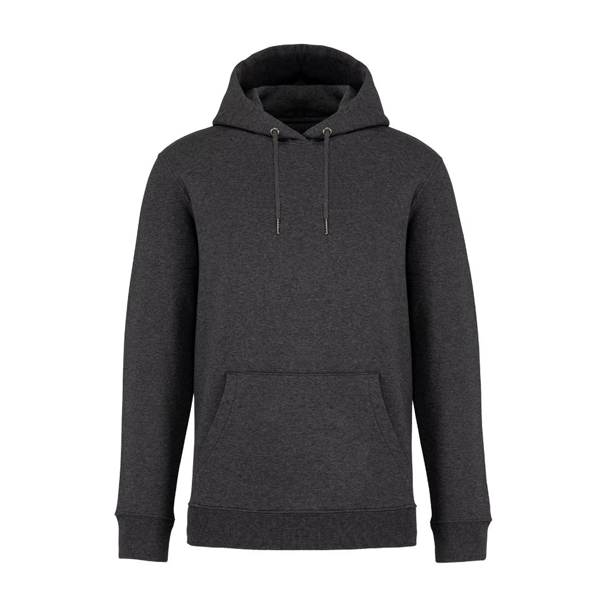 85 % algodón orgánico / 15 % poliéster reciclado postconsumo. Algodón peinado Ringspun. Corte ajustado. Lavado con enzimas. Felpa perchada de 3 hilos LSF (Low Shrinkage Fleece, felpa preencogida). Media luna en la espalda. Bolsillo tipo canguro. Canalé 1 x 1 en el bajo de la prenda y el bajo de las mangas. Doble pespunte en el bajo de las mangas, sisas, bajo de la prenda y media luna. Tira cubrecosturas en la parte interior trasera del cuello. Capucha forrada en el material principal con tope de cordón. Cordón redondo con puntas y ojales de metal reciclado.