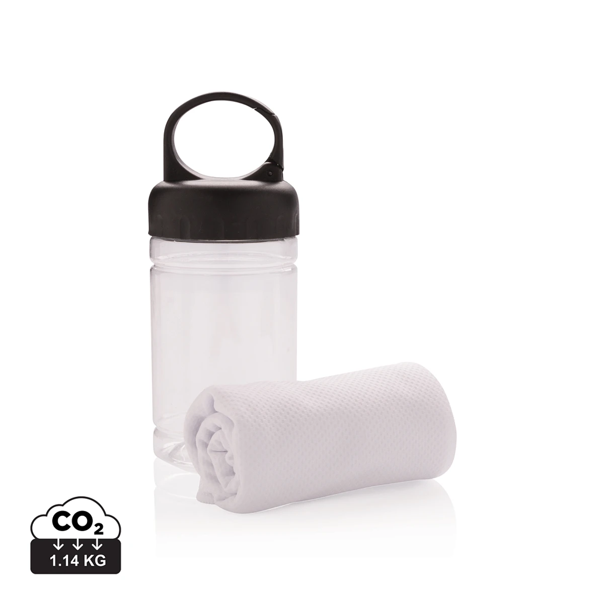 Toalla enfriadora de microfibra 100% libre de productos químicos. Bloquea el sol un 98% hasta protección solar UV 50+. La toalla se puede usar fácilmente añadiendo agua fría a la botella para que refresque rápidamente. La botella es de PP y parte superior de ABS. Incorpora mosquetón para que la puedas colgar en tus actividades al aire libre. 77 x 30cm.