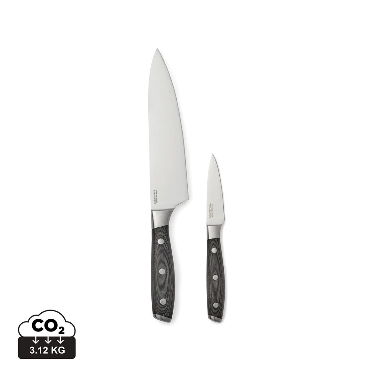 Jeu d'un couteau de chef et d'un couteau à légumes. Les couteaux sont fabriqués en acier allemand X50CrMoV15 avec un manche en Pakkawood. Le manche ergonomique et l'excellent équilibre de la lame rendent le couteau confortable et facile à manœuvrer. Couteau à oignons : lame de 20 cm. Couteau à légumes : lame de 8 cm.