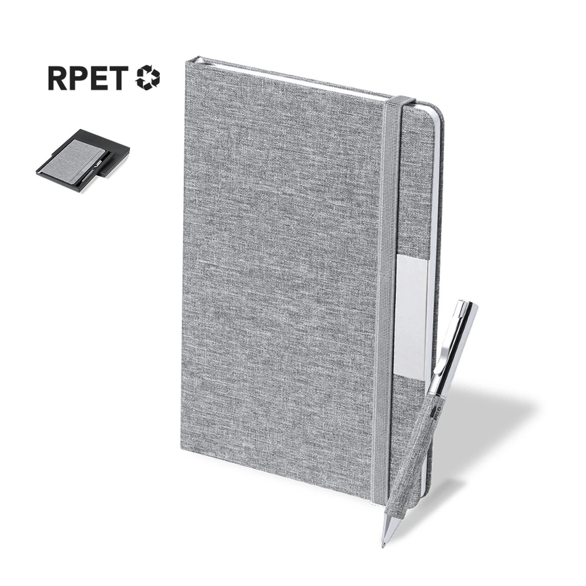 Set de bloc de notas y bolígrafo en RPET, elaborado a partir de plástico reciclado para así fomentar la reutilización de residuos plásticos y ayudar a la sostenibilidad del planeta. Incluye: Bloc de notas de tapas rígidas, con detalle metálico en la portada, marcapáginas de tela y elástico de sujeción a juego. 100 hojas interiores con disposición a una raya y distintivo RPET.Bolígrafo fabricado en metal cromado y con cuerpo recubierto en poliéster RPET. Elegante clip metálico y accesorios a juego, de mecanismo giratorio y en tinta azul. Con distintivo RPET en cuerpo.Set presentado en elegante estuche de diseño en color negro, con compartimento independiente para bloc de notas y bolígrafo.